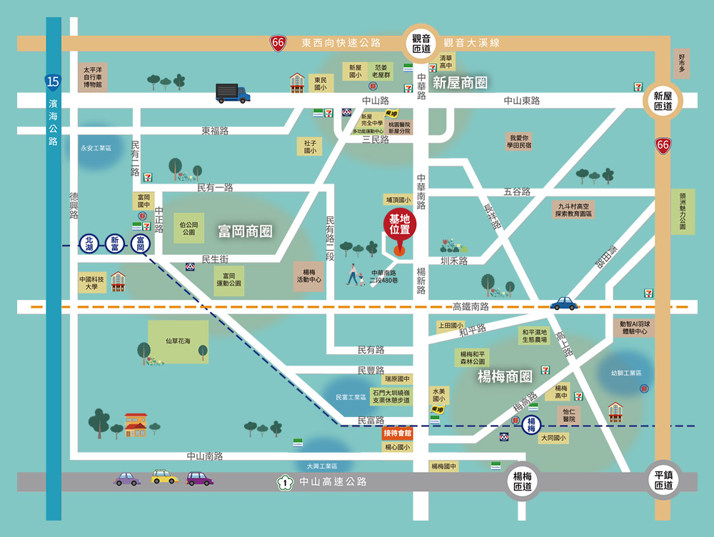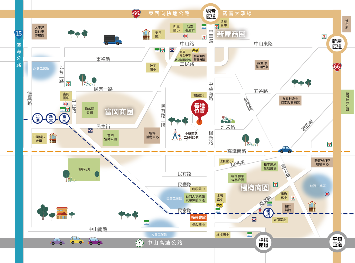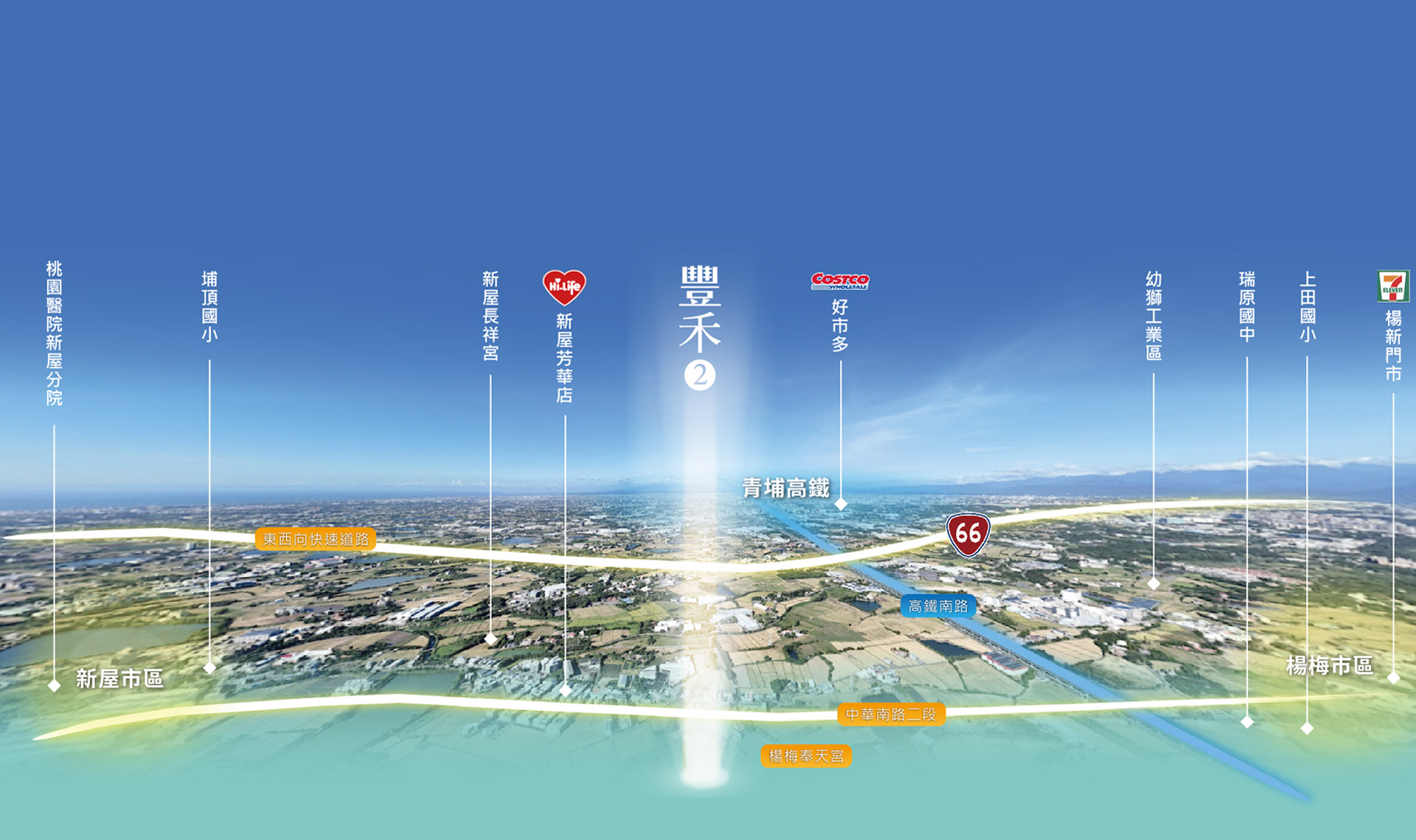 鄰近新屋中華路核心商圈,串連全聯、屈臣氏、肯德基與85度C等連鎖品牌,生活機能完善,從採買、用餐到日常所需,皆可步行輕鬆滿足。